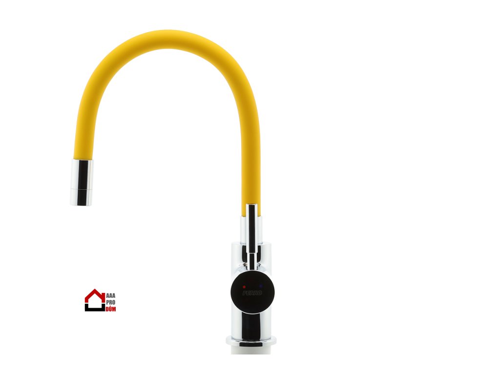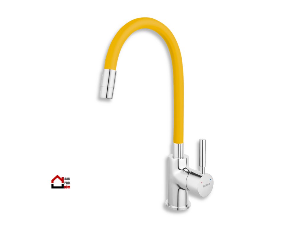 Prvotřídní povrchová úprava a chrom. Stojánková dřezová baterie s žlutým FLEXI ramenem. Součástí baterie jsou přívodní hadičky.